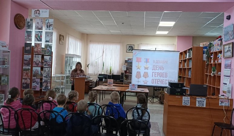 Сегодня в библиотеке для ребят из детского сада прошёл урок мужества, посвященный Дню Героев Отечества. Дети узнали историю возникновения праздника, вспомнили имена героев нашей страны: от Древней Руси и до наших дней. Познакомились с понятиями «Отечество», «Герои Отечества». Внимательно слушали рассказ о подвигах героев, сопровождавшийся презентацией, отвечали на вопросы. Особое внимание было уделено рассказу о городе Томске - в годы ВОВ в нём располагалось 32 эвакуированных предприятия. Нашему городу было присвоено почётное звание "Город трудовой доблести и славы". Гости библиотеки узнали, что и в Моряковском Затоне были герои войны, в честь которых названы улицы села. Одним из таких героев был Павел Степанович Гребнев - полный кавалер Ордена Славы.