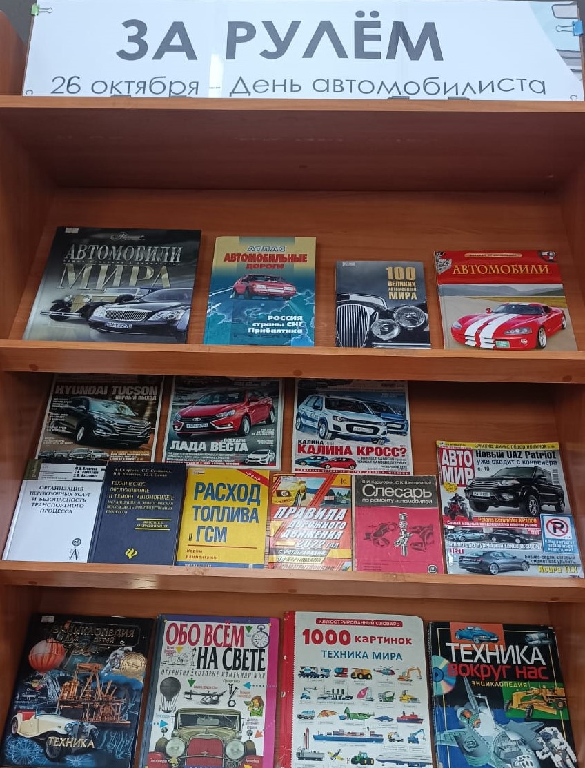 К этому замечательному празднику в читальном зале библиотеки оформлена книжная выставка «За рулём». Приглашаем наших читателей окунуться в захватывающее путешествие по страницам книг, посвященных миру автомобилей! Книжная выставка распахнет двери в удивительную историю создания и развития автотранспорта. Здесь вы сможете узнать о первых самодвижущихся экипажах, о легендарных конструкторах и инженерах, о самых знаменитых автомобилях, а ещё на выставке представлены издания по основам безопасного вождения, обслуживанию и ремонту автомобиля, учебники по вождению и даже инструкция для автоледи.