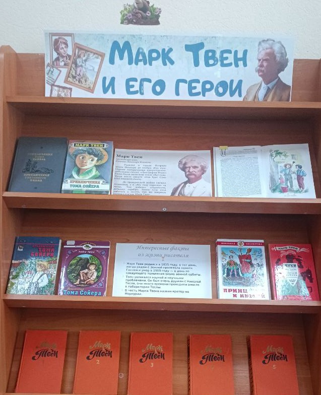 К юбилею писателя в читальном зале библиотеки оформлена книжная выставка «Марк Твен и его герои». На выставке представлены его известные произведения: романы «Приключения Тома Сойера» и «Приключения Гекельберри Финна», повести «Принц и нищий», «Янки из Коннектикута при дворе короля Артура» и интересные факты биографии писателя.
