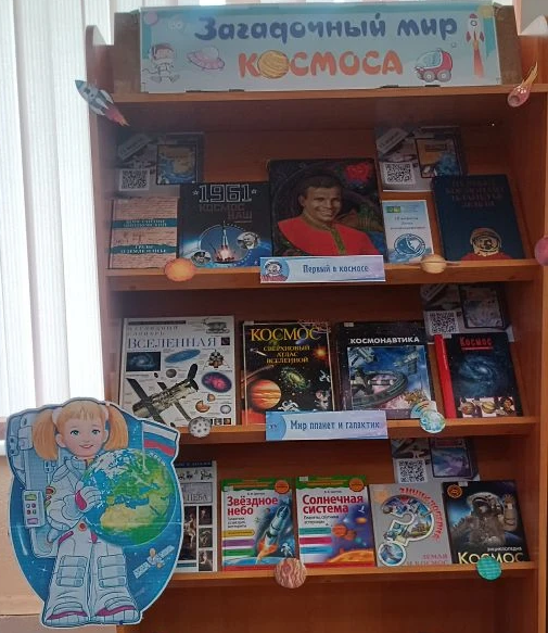 В преддверии Дня космонавтики в читальном зале библиотеки оформлена книжно-иллюстративная выставка «Загадочный мир космоса». На выставке представлены издания, которые помогут юным читателям узнать о древней науке астрономии, мире звёзд и галактик, планет и комет. Книги расскажут о космических кораблях и загадках Вселенной, об истории развития космонавтики и ракетостроения, основоположниках космонавтики, о первом лётчике-космонавте Юрии Алексеевиче Гагарине и о других бесстрашных покорителях космоса. Читатели смогут познакомиться с энциклопедиями различных серий, названия которых говорят о многом: «Земля и Космос», «Космос», «Космонавтика», «Звездное небо», «Солнечная система», «Мифы звездного неба» и многие другие. Ещё гости библиотеки могут перейти по QR- кодам, которые представлены на выставке и прочитать замечательные книги о Земле, Луне, Солнце и Млечном пути и увидеть вид на Землю с МКС онлайн.